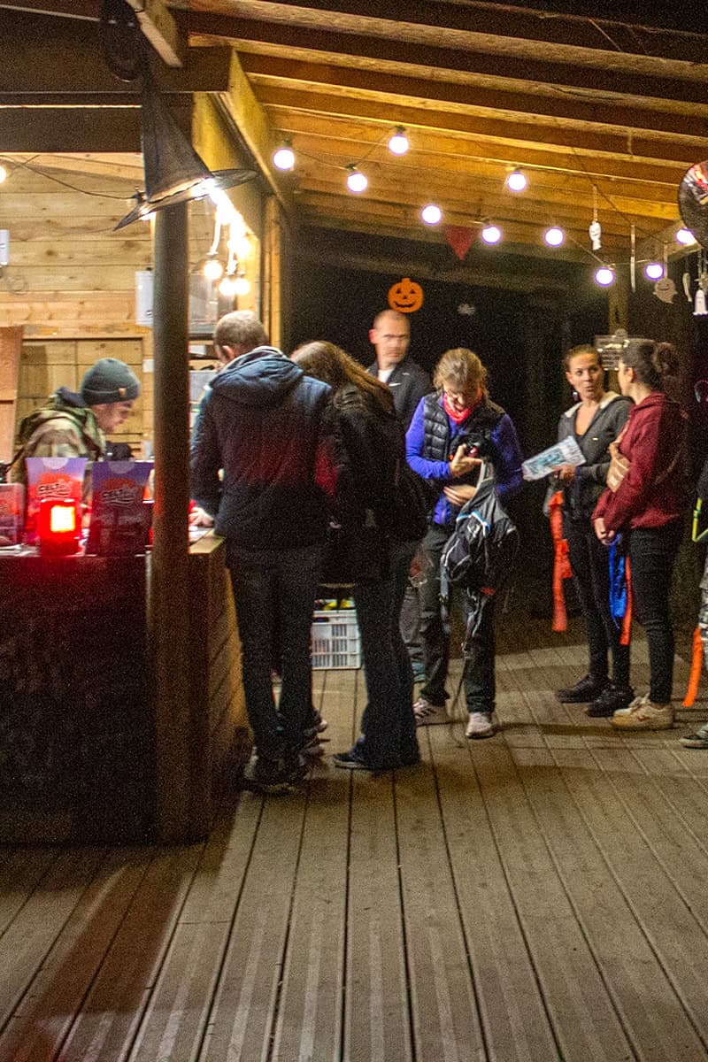 Accueil des participants, répartition des rôles, explication des règles, remise des accessoires (ceintures de vie, cartes, lampes…). L’ambiance sonore et les décors plantent le décor : la course commence dans une atmosphère de fin du monde.